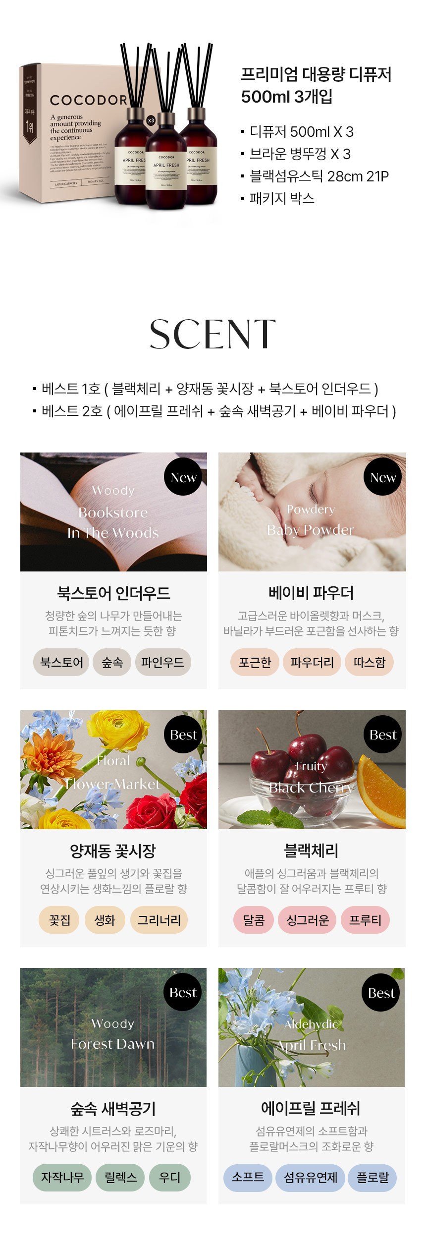 코코도르 블랙체리향은 제주도 여행당시 5성급 호텔에서 처음 맡아보고 넘 좋아서 계속 곁에 두는 디퓨저인데~향이 정말 상큼하면서 고급져요~향 하나로 두개의 느낌이 공존하기 어려운데 묵직하면서도 머리아프지않고 은은하게 퍼지는 매력적인 향입니다~대용량에 3개...저렴하게 사서 완전 기분 좋네요~